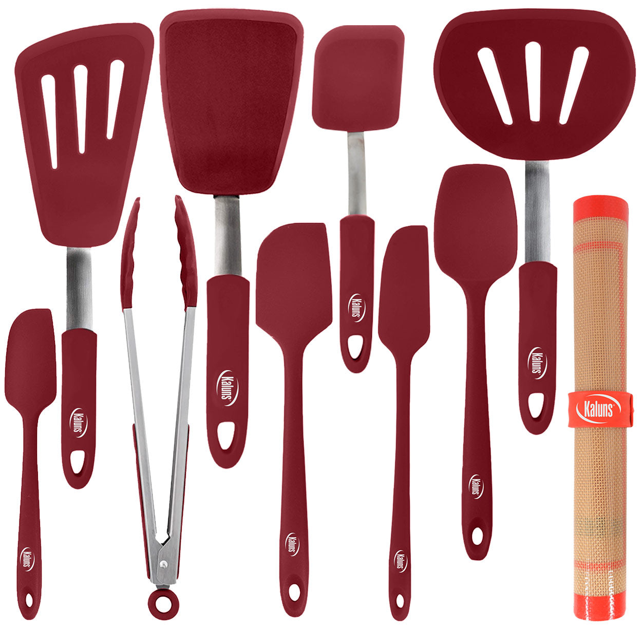 Our 11 piece set has got it all. Flexible Silicone Spatulas to scrub out the last licks of the batter, turners to flip over your juicy slice of salmon, or use the 12" tong to reach your hot steak and swish it over. The Baking mat is great for baking cookies.