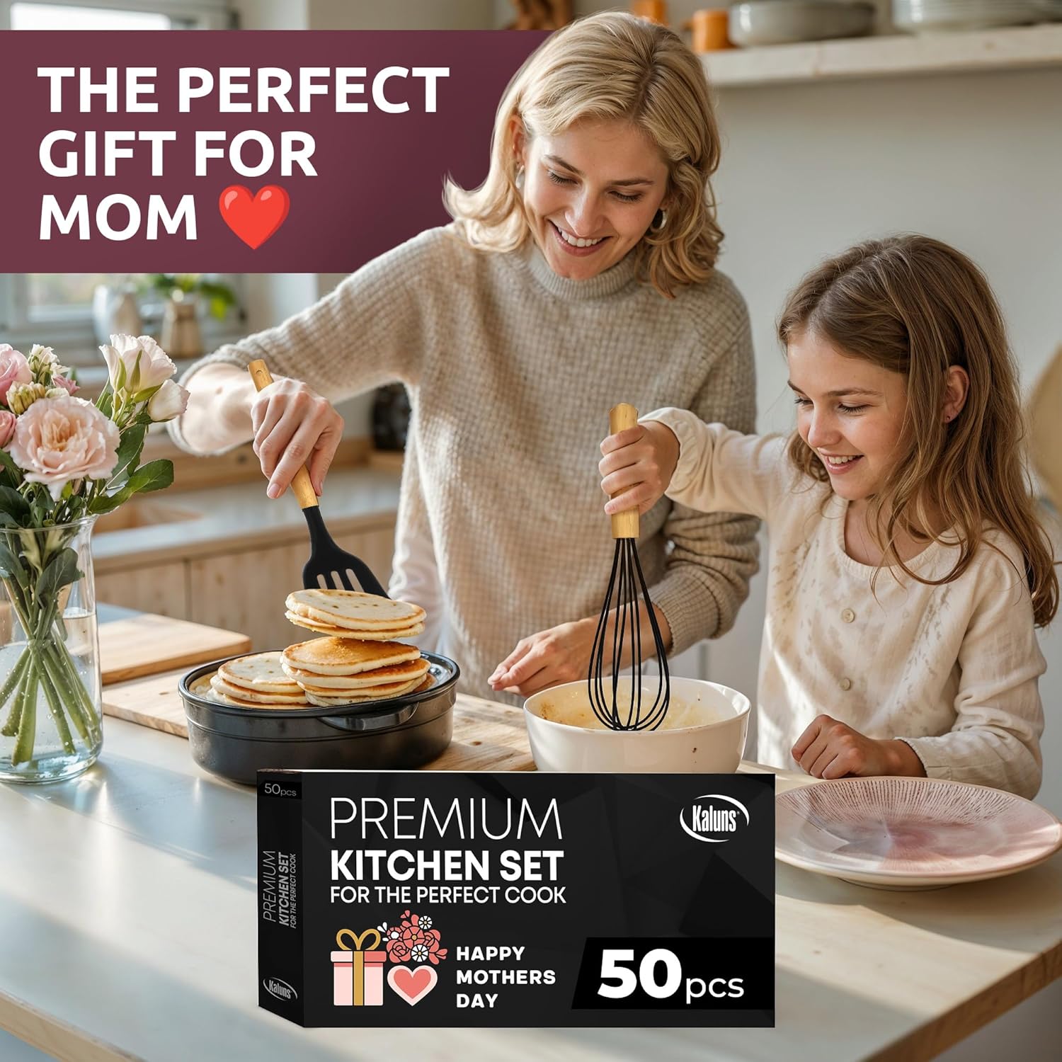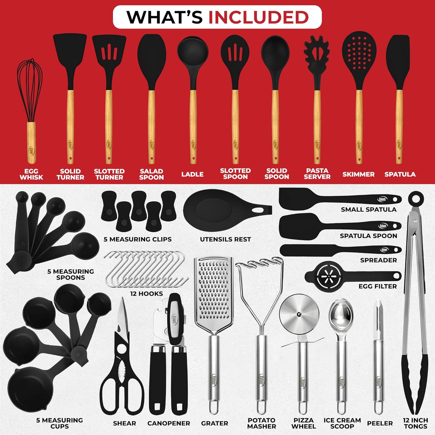 With our premium 50-piece Silicone utensil set includes everything you need for a complete cooking experience. It features the most extensive and exclusive selection of cooking utensils currently on the market.